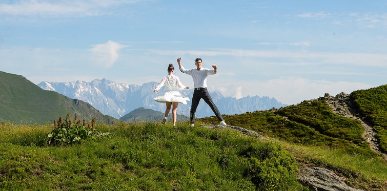 Schnee am Berg, blühende Wiesen im Tal, klare Luft und sonnige Wege: