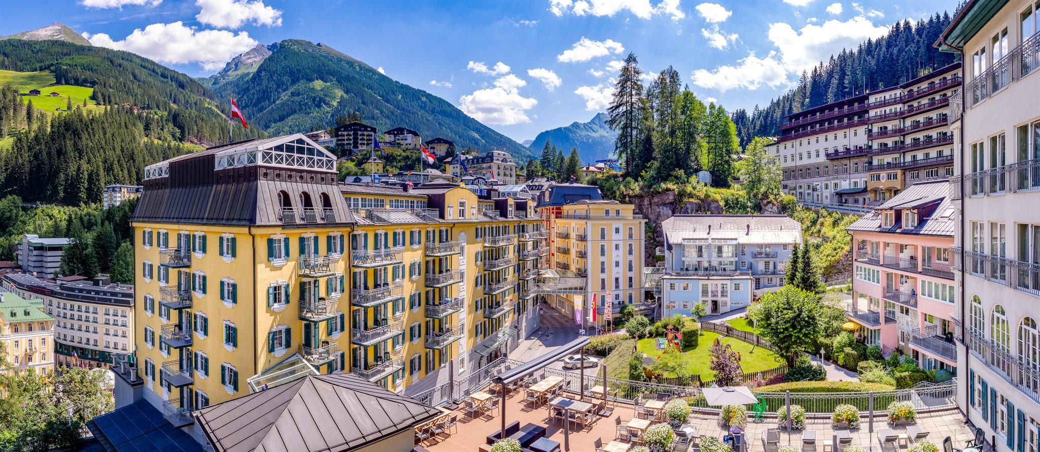 Im Zentrum von Bad Gastein mit spektakulärem Ausblick auf die Bergwelt inmitten des Nationalpark Hohe Tauern erwartet Sie unser familienfreundliches 4-Sterne-Hotel. Wir bieten: komfortable Zimmer und Suiten, herrlichen Panoramablick, Wellnessbereich, Tagungsraum (bis zu 250 Personen), Bar, 3 Restaurants, davon eine eigene Alm, gratis Kinderbetreuung, günstige Pauschalangebote uvm. Die Skilifte (Bushaltestelle ca. 150 m vom Hotel entfernt), Bergbahnen und Felsentherme sind gleich nebenan.