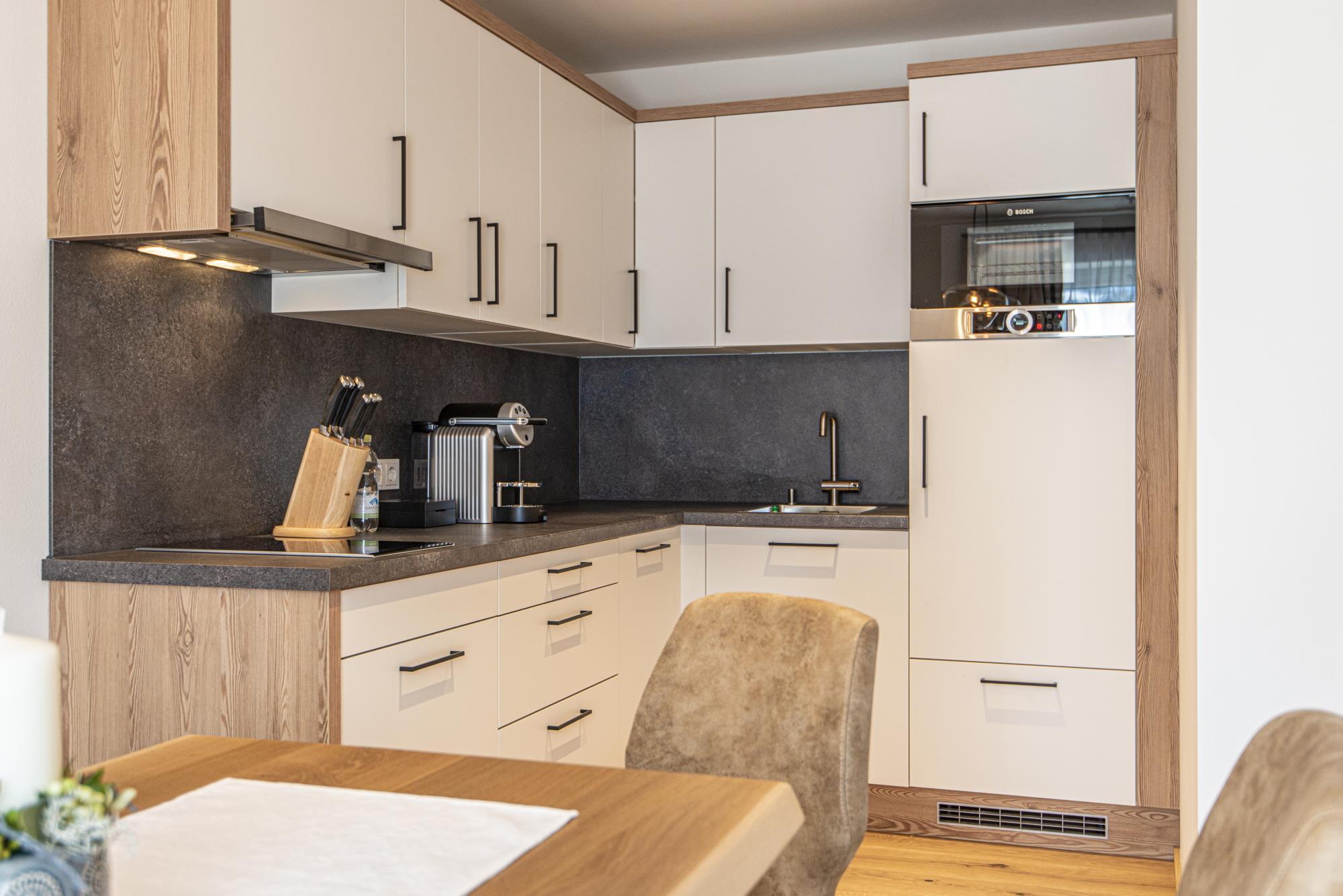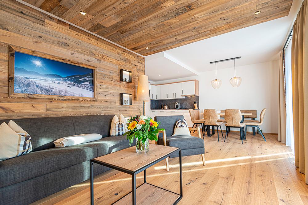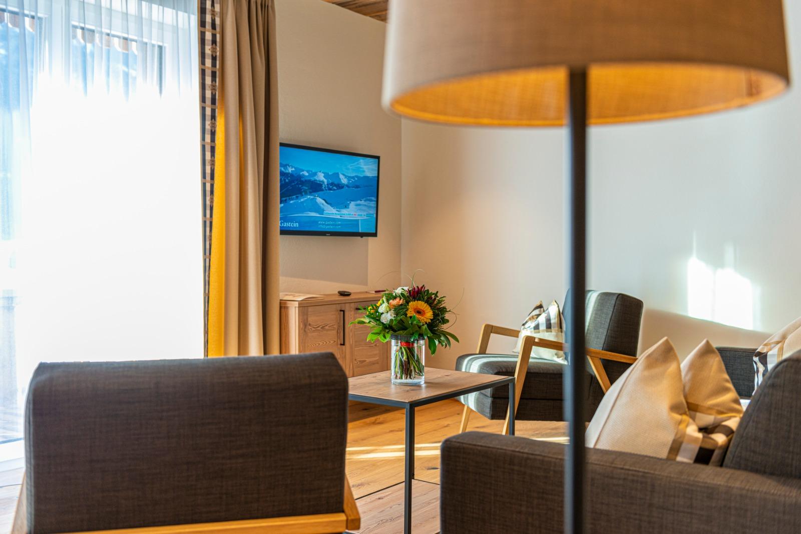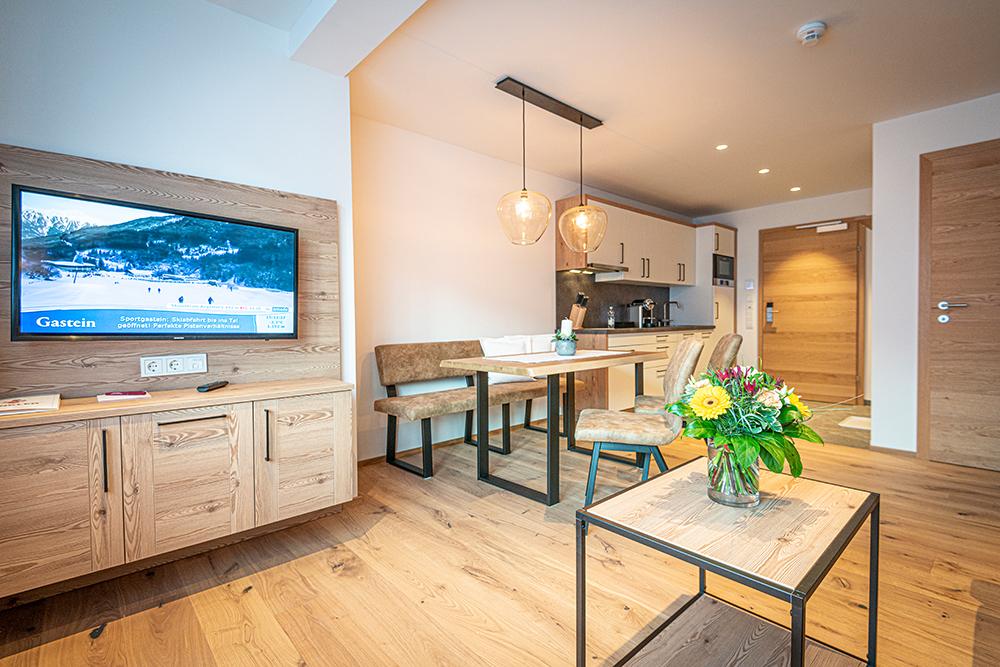 In the newly built chalets you live in the best location with the highest level of comfort. All apartments are between 40 m2 and 80 m2 in size and are named after the local mountains. The name says it all, because the magnificent view is guaranteed to make mountain lovers' hearts beat faster. The complete kitchen equipment, fiber optic internet and underfloor heating are just as standard in all units as high-quality local materials. All apartments are equipped with balconies, from which you can enjoy the wonderful panoramic view of the Gastein mountains without restrictions. On request, fresh pastries can be brought to your door in the morning. A special highlight is the in-house "Genießerbar", a cozy meeting place for breakfast and lunch in a modern, alpine ambience. Here you can start the day well strengthened every morning à la carte (for a surcharge).