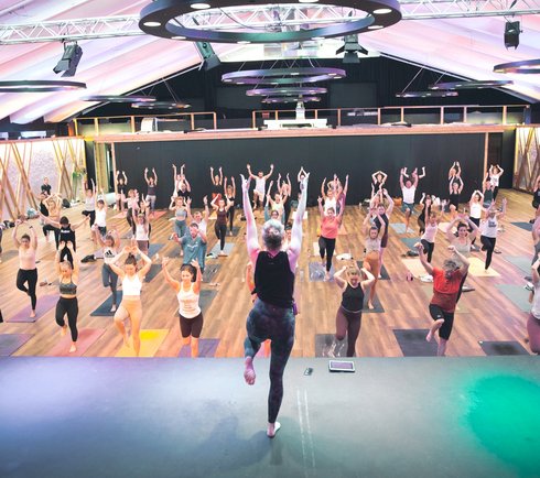 The Flowstage in the Gastein Alm is with its over 500 m² the largest event space of the yunion yoga festivals. The wooden floor is quiet and the sound is fantastic. The teachers are perfectly understandable up to the last corner. The modern lighting system sets the entire room in harmonious light scenes and creates very special moments of atmosphere.