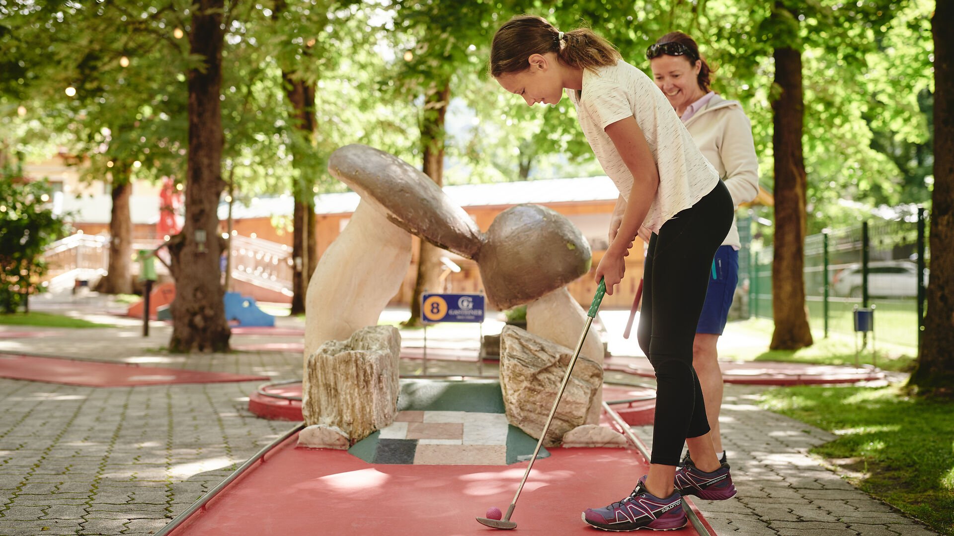 Unter schattenspendenden Bäumen wird Minigolf in Bad Hofgastein zum sommerlichen Freizeitspaß. Die 18 abwechslungsreichen Bahnen erfordern Geschick und ein gutes Auge. Dabei sorgen Bodenwellen und Hindernisse für spannende Herausforderungen. Ein kleiner Spielplatz begeistert besonders Kinder, während der charmante Holzkiosk mit Eis und kühlen Getränken zur Pause einlädt. Wer nach der Partie noch Energie hat, kann sich direkt daneben an der traditionellen Holzkegelbahn versuchen.