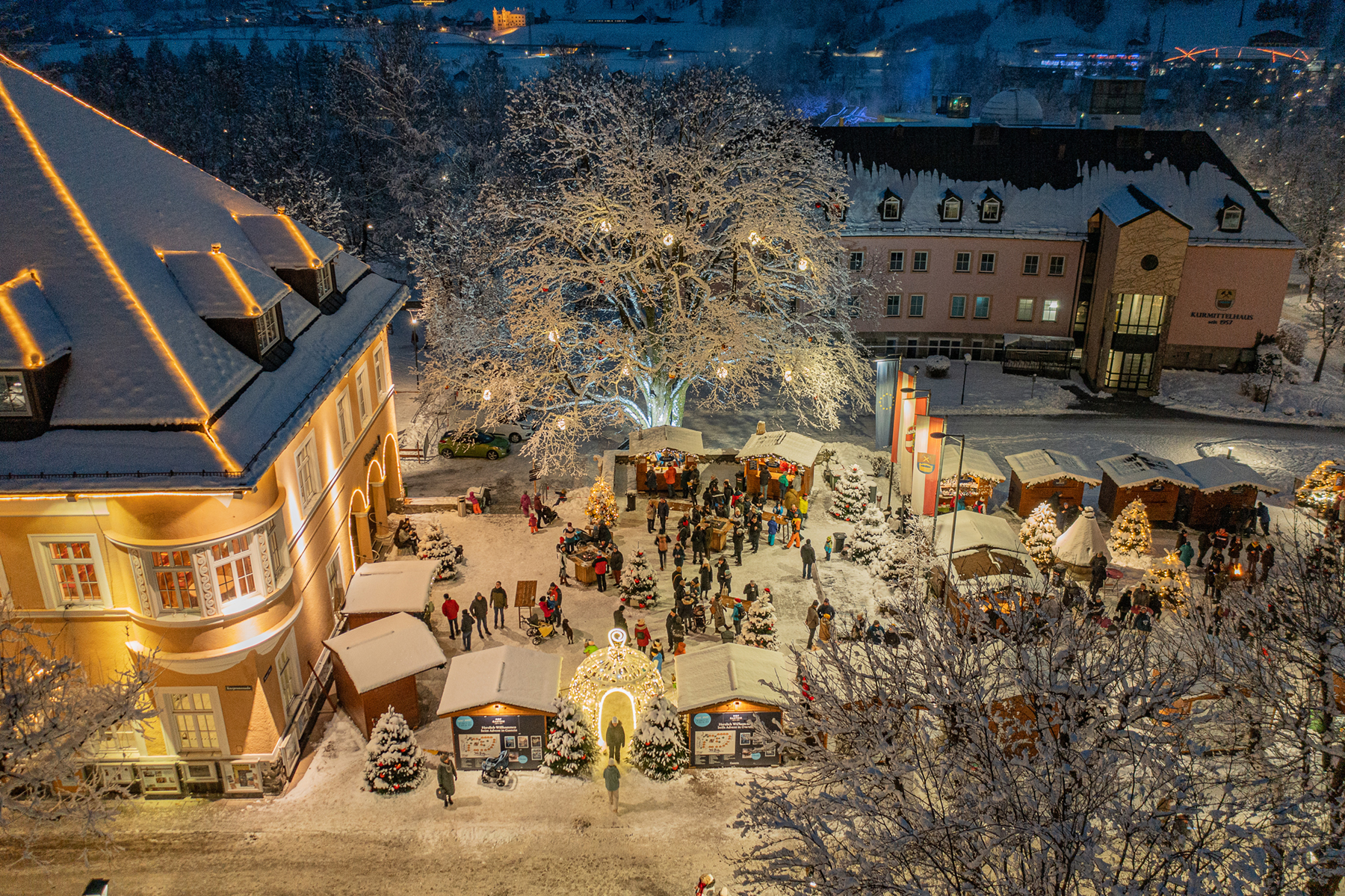 Der Ortskern von Bad Hofgastein mit seiner weihnachtlich beleuchteten Fußgängerzone bietet eine stimmungsvolle Kulisse. Tradition und Vielfalt garantieren heimische Volksmusikgruppen und Turmbläser. Erleben Sie viel Romantik und Idylle am Adventmarkt - vielleicht auch bei Pferdeschlittenfahrten im verschneiten Kurpark.