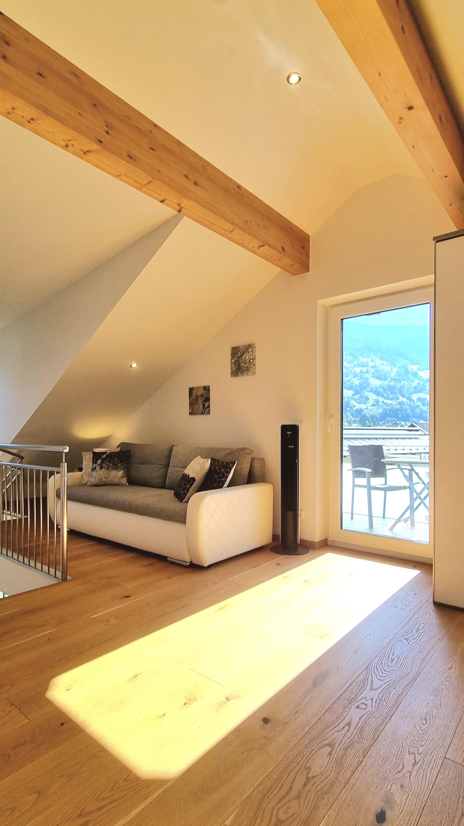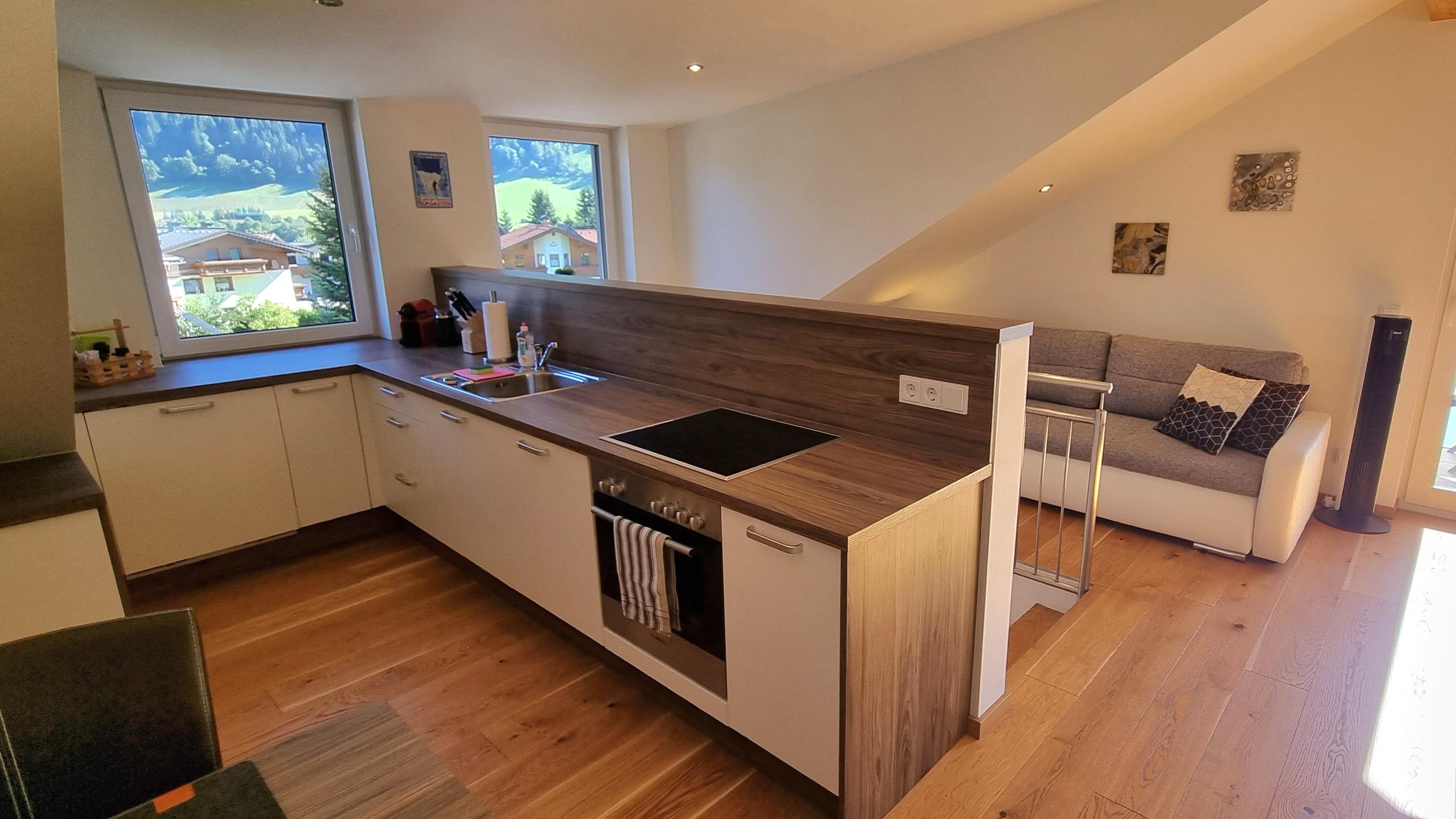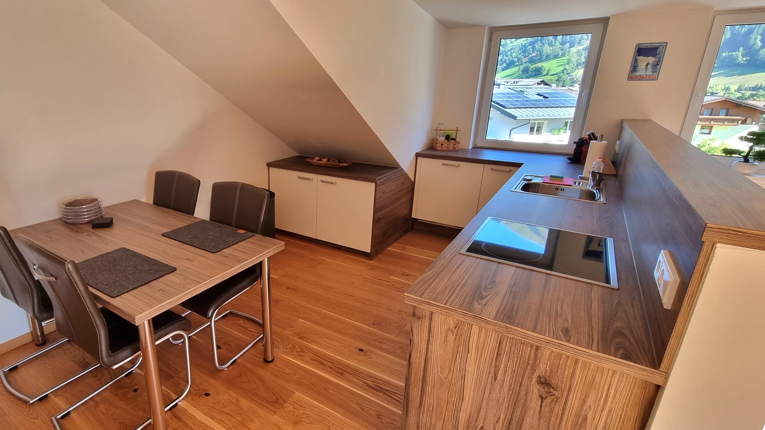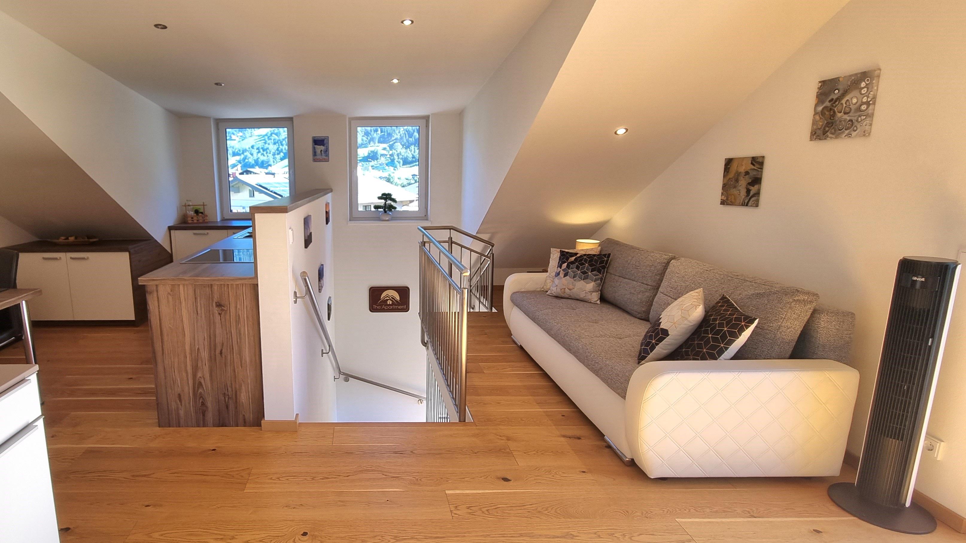 "The.Apartment" is gelegen in het zuiden van Bad Hofgastein. Het appartement bevindt zich op de bovenste verdieping en zolder van ons ouderlijk huis. Een aparte buitentrap leidt naar de voorkamer op de bovenverdieping en vervolgens een interne trap naar de zolder. Het appartement is ongeveer 60m². De keuken is voorzien van een Nespresso koffiemachine, vaatwasser, gasfornuis en oven. De badkamer heeft een grote, gelijkvloerse douche. In totaal beschikt het appartement over 8 ramen, waaronder 3 dakramen en een balkondeur. Alle ramen hebben elektrische rolluiken. Het balkon is ca. 4m² inclusief tafel, stoelen en parasol. Een van de vele kabel-tv-zenders kan vanaf de bank of het bed worden bekeken op de draaibare 40-inch flatscreen-tv. Het tweepersoonsbed is 1.80m x 2.00m. Lakens, kussens en dekbedden zijn aanwezig, evenals handdoeken in de badkamer. Een parkeerplaats direct bij het huis is inbegrepen. Het appartement is ontworpen voor 2 personen, maar de optie van een 3e persoon (slaapbank) is mogelijk tegen een meerprijs.