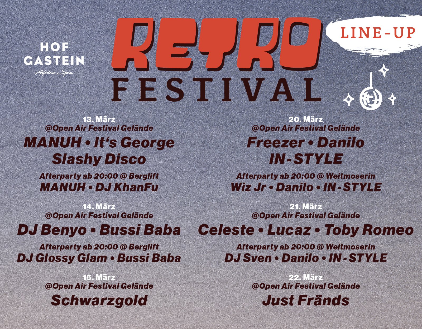 Die Party Weekends beim Retro Festival verwandeln die Schlossalm und die angesagtesten Locations wie Hirsch & Maus und die Bergstation der Schlossalmbahn in ein pulsierendes Zentrum voller Retro-Disco-Vibes. Von Open-Air-Stages über energiegeladene DJ-Sets bis zur Afterparty im Tal verbindet sich Musik, Style und Lebensfreude zu einem unvergesslichen Erlebnis. Tagsüber Sonne auf der Terrasse, abends Beats, Tanz und Party – hier wird der Winter stilvoll verabschiedet und der Frühling gefeiert.
